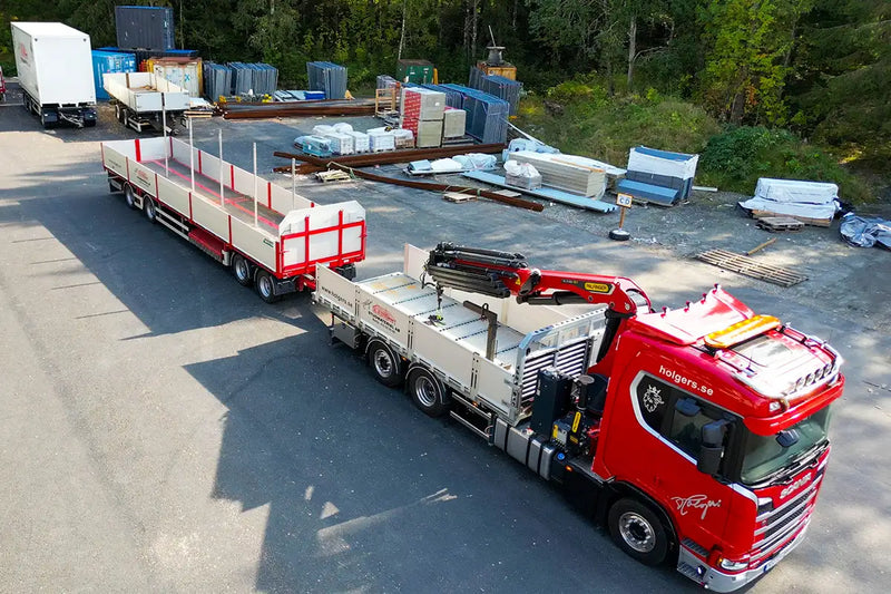 Utöver våra lastbilar har vi släp för större leveranser, både öppna och skåp med dubbla öppningsbara sidor.