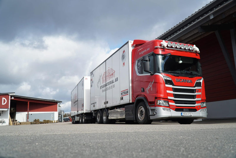 Med våra egna chaufförer kan vi stolt skryta med att vi har ytterst få transportskador på godset. Detta då chaufförerna vet hur materialet skall hanteras. När vi transporterar ditt material på vägen vet vi att det inte bara är byggmaterial som ligger på flaket, det är materialet som ska vara med och bygga din dröm.