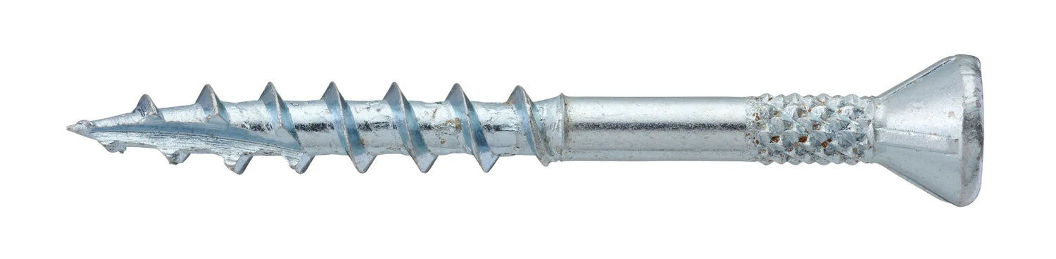 Vass spets och gängor anpassade för förankring i trä. Gängorna griper omedelbart och drar in skruven i spånskivan, samtidigt som rillorna under huvudet försänker skruven. Skruven har även en skärande borrspets för att förhindra sprickbildning i trä.