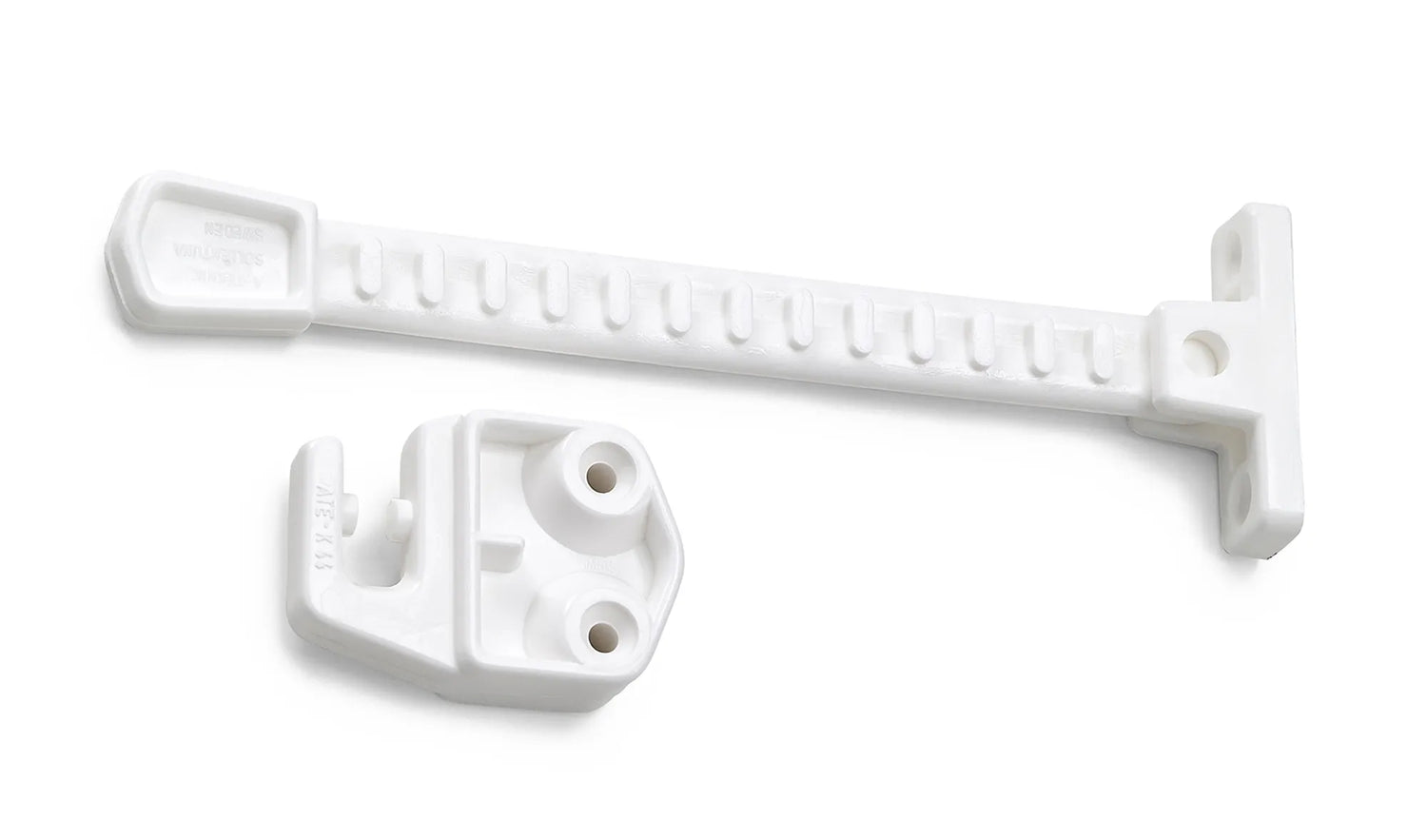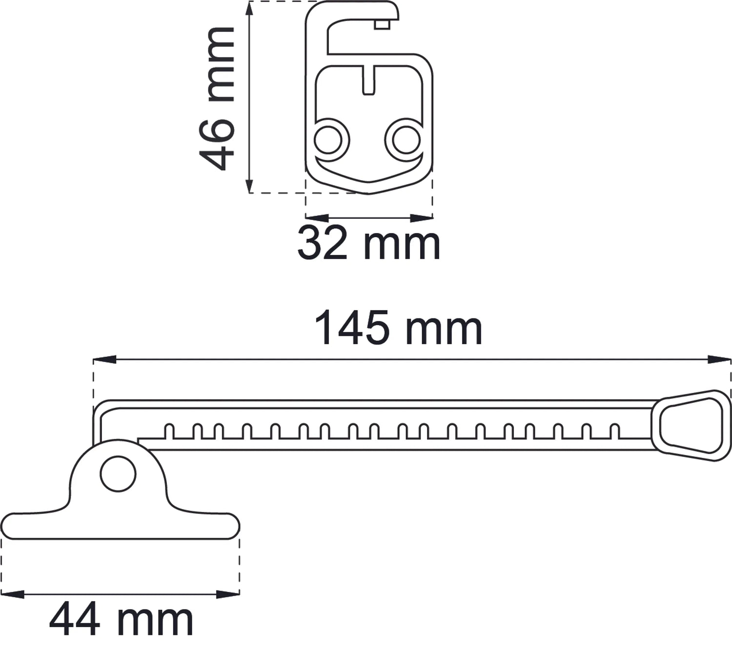 Fönsterhållare av plast för inåtgående fönster. Hake ingår. Längd 145 mm. Ej barnsäkrat.