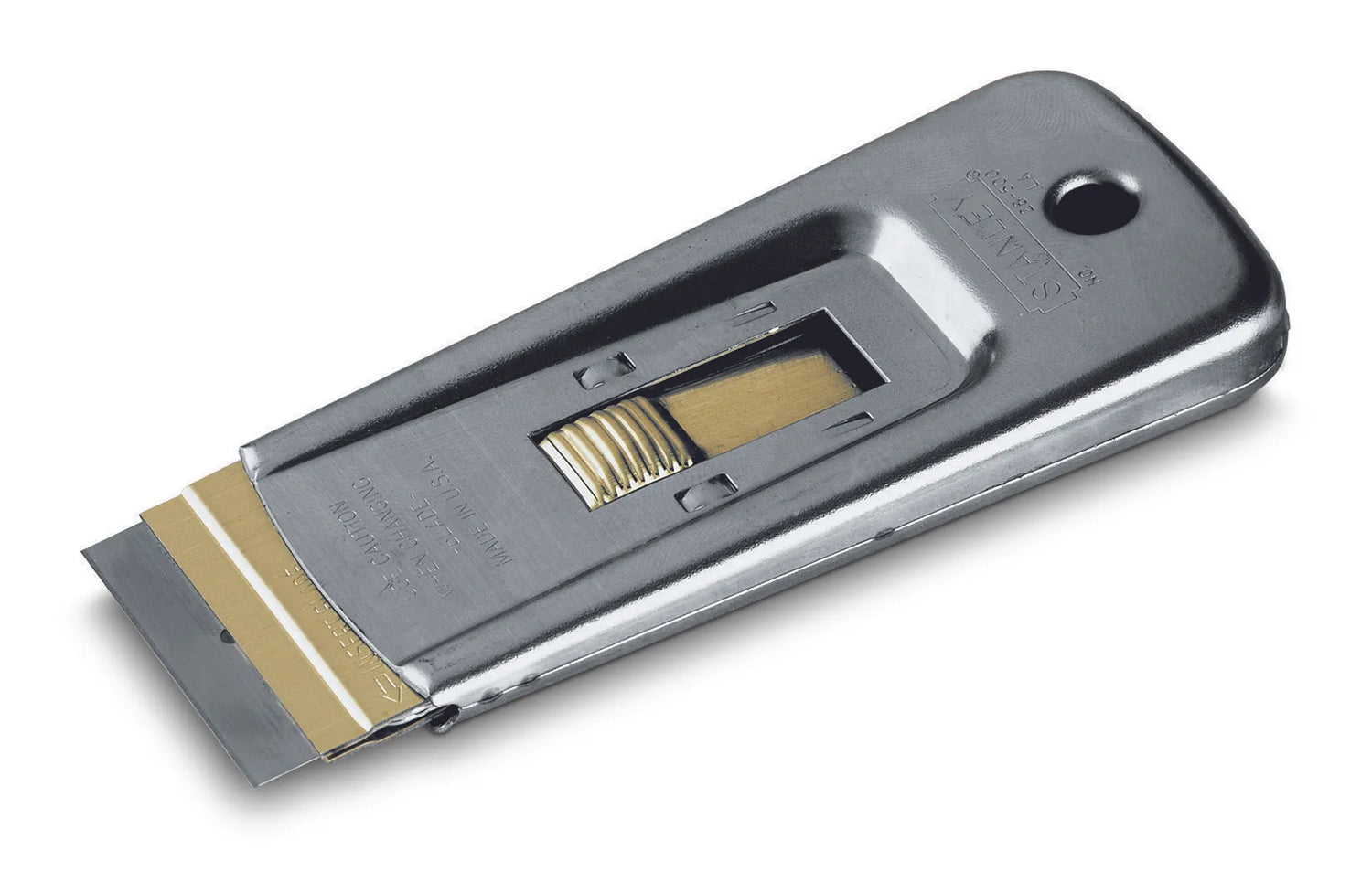 Professionell kvalitet. Indragbart rektangulärt blad. Tryckknapp i mässing. Metallhus Perfekt verktyg för att skrapa bort målarfärg, lim. Ersättningsblad 0-28-510 och 1-11-515.