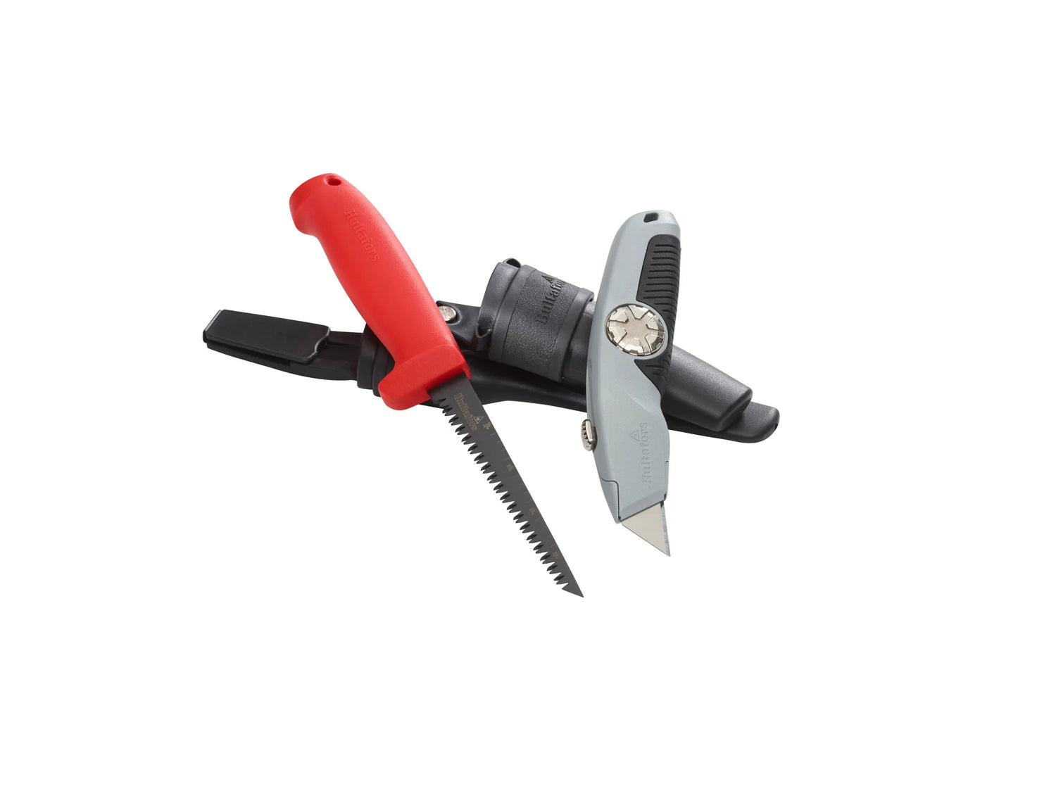 Dubbelhölster JS+URA består av gipssågen JS och universalkniven URA – en perfekt kombination för den som jobbar mycket med gips.