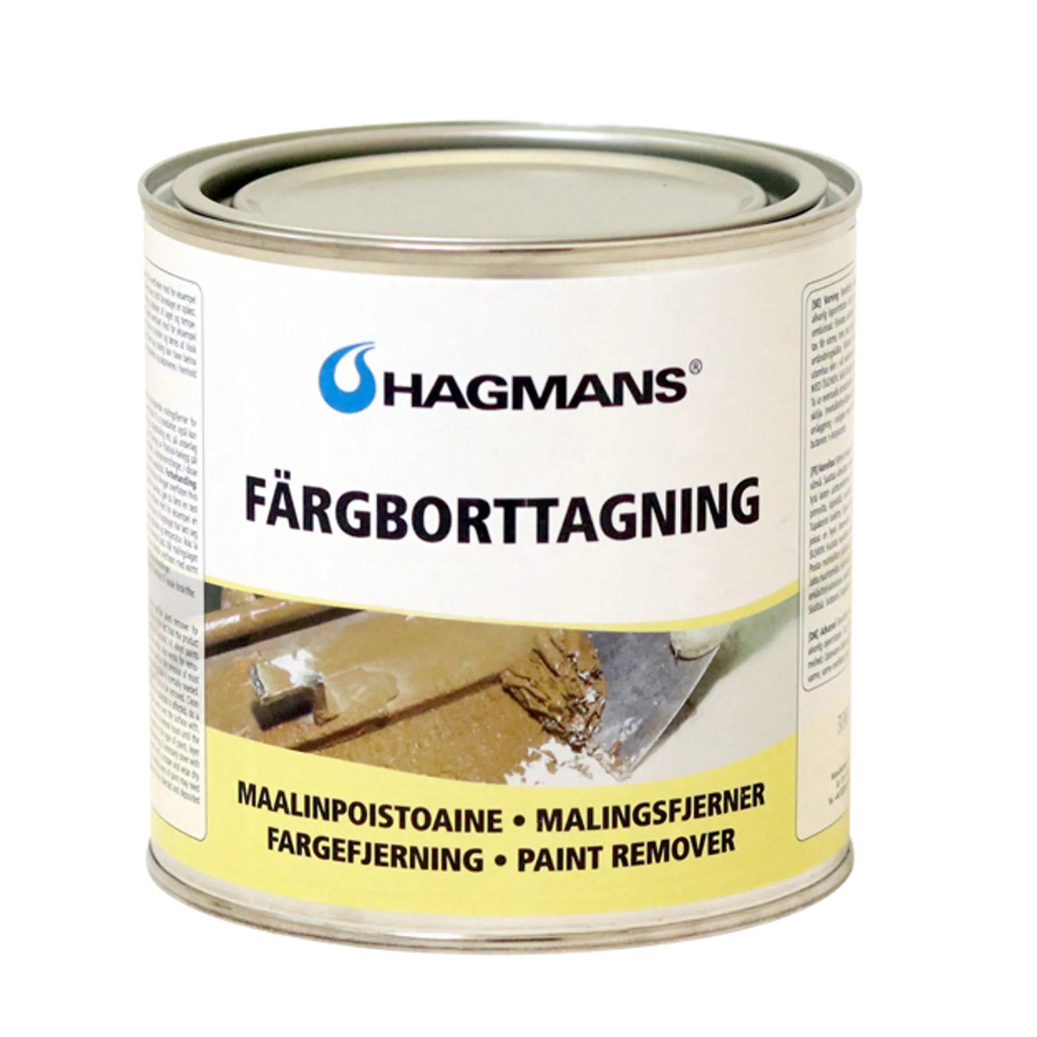 Hagmans Färgborttagning är ett effektivt gelaktigt färgborttagningsmedel för avlägsning av färgskikt. Den gelaktiga konsistensen bidrar till att produkten även kan appliceras på lodräta ytor. För borttagning av akrylat-, olje, alkydfärger mm på underlag av exempelvis betong, trä och plåt. Fungerar även för borttagning av plastisolbeläggningar på plåt. Kan även användas för borttagning av flertalet 2-komp färger, i dessa fall behövs dock normalt längre verkningstid.
