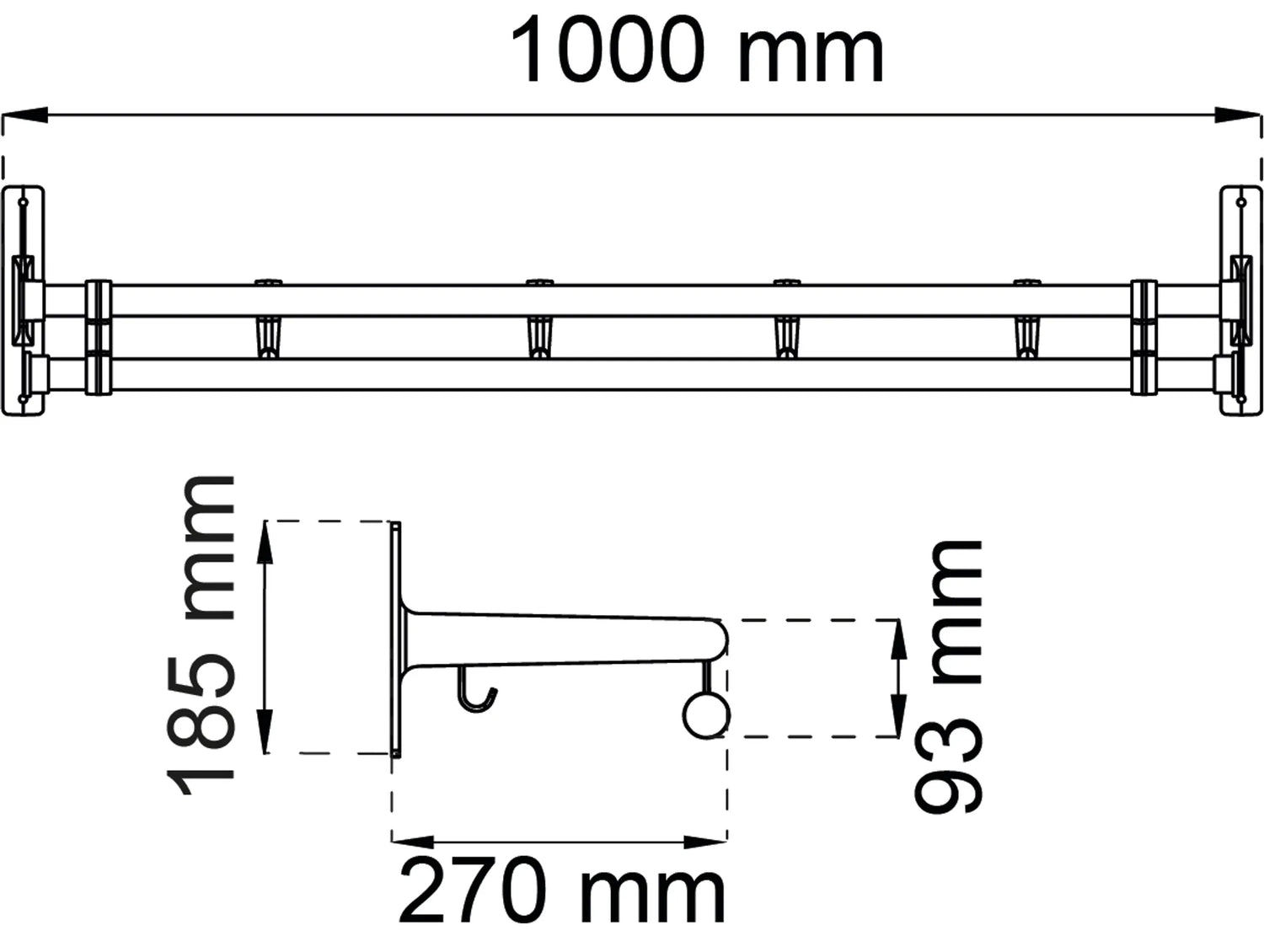 Elegant hatthylla med gavlar och enkelkrokar av aluminium. Stänger av ek. Har en extra stång för upphängning av kläder och är utrustad för förvaring av kläder, hattar och skor. Levereras omonterad. Hyllan har bredd 1000 mm och utsprång 270 mm. Rördiameter 25 mm.