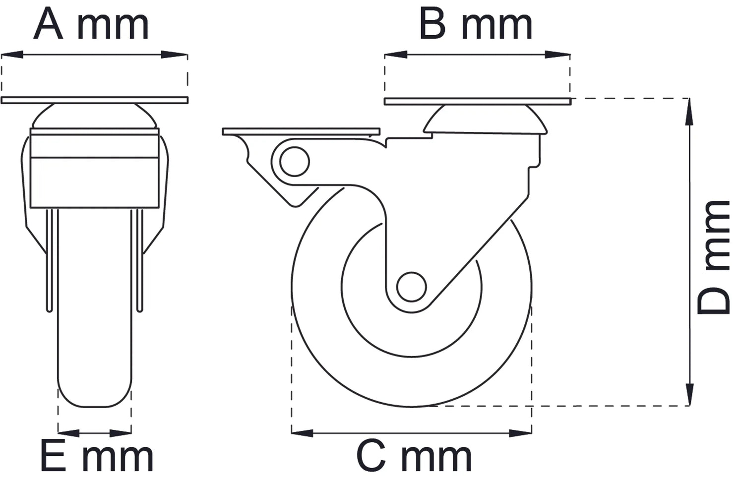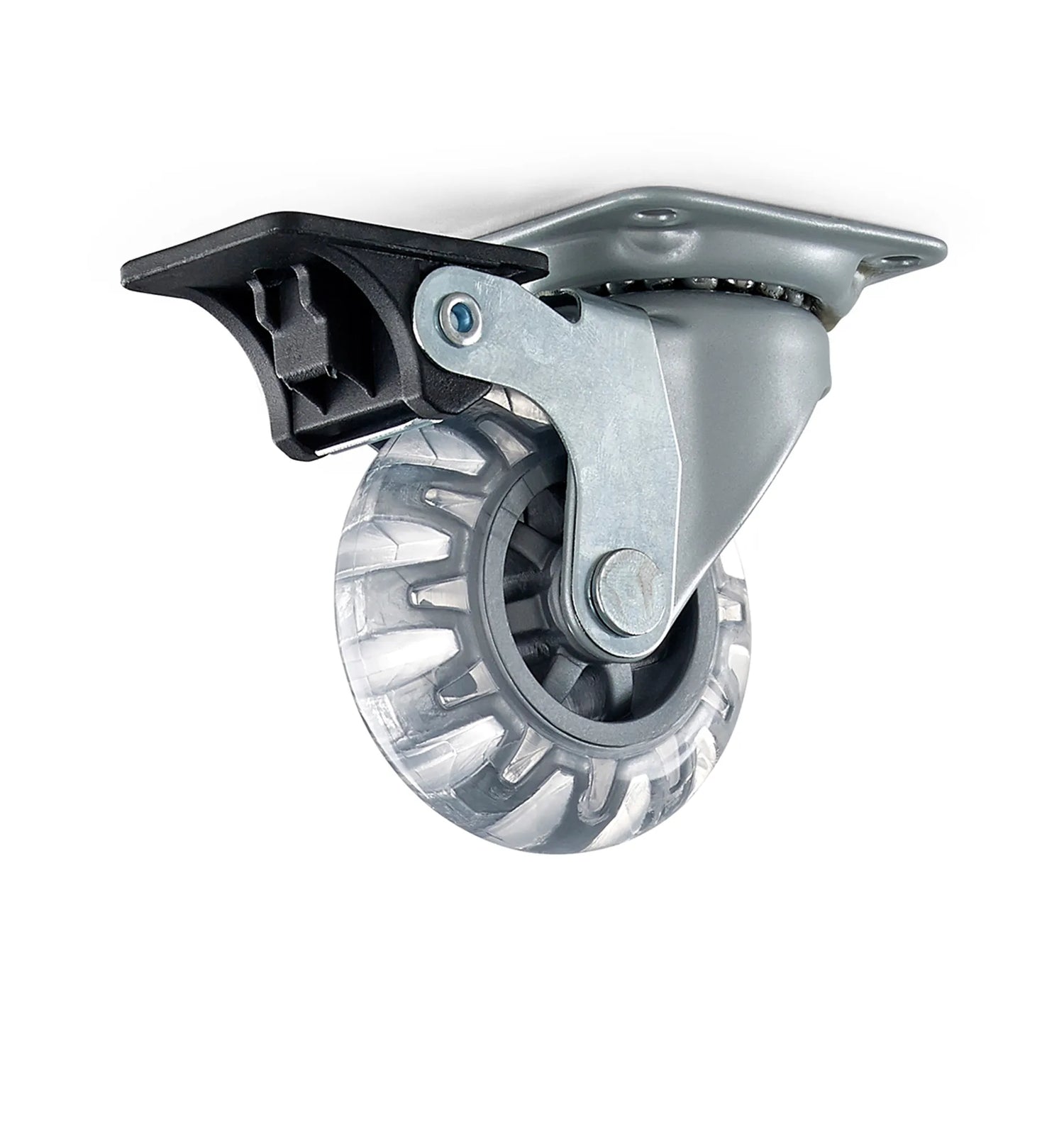 Svängbart möbelhjul av stål med hjulbroms. Hjul Ø 50 mm av polyuretan (PUR). Maxbelastning 40 kg per hjul (beräknat värde, garanteras inte).