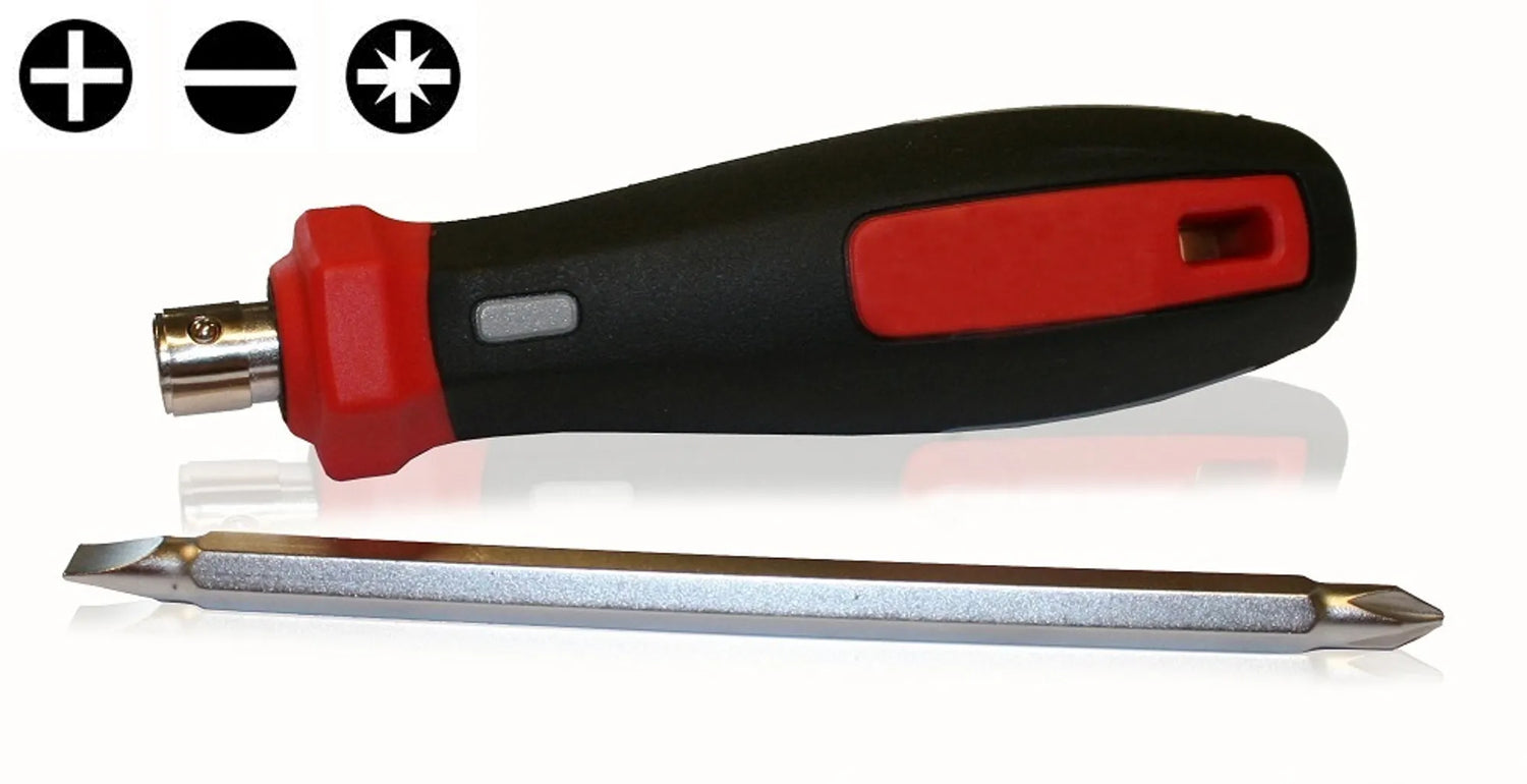 All In One skruvmejsel med vändbar klinga i S2 stål klarar Phillips 0/1/2/3, Pozidrive 1/2/3 samt Spår 6 mm. Den vändbara klingan fungerar även utmärkt som ett långt bits (126 mm) att sätta i din skruvdragare! Ergonomiskt utformat gummerat handtag i tvåkomponentsmaterial med motståndskraftig hårdplast som ger användaren ett skönt grepp med god känsla och ergonomi.