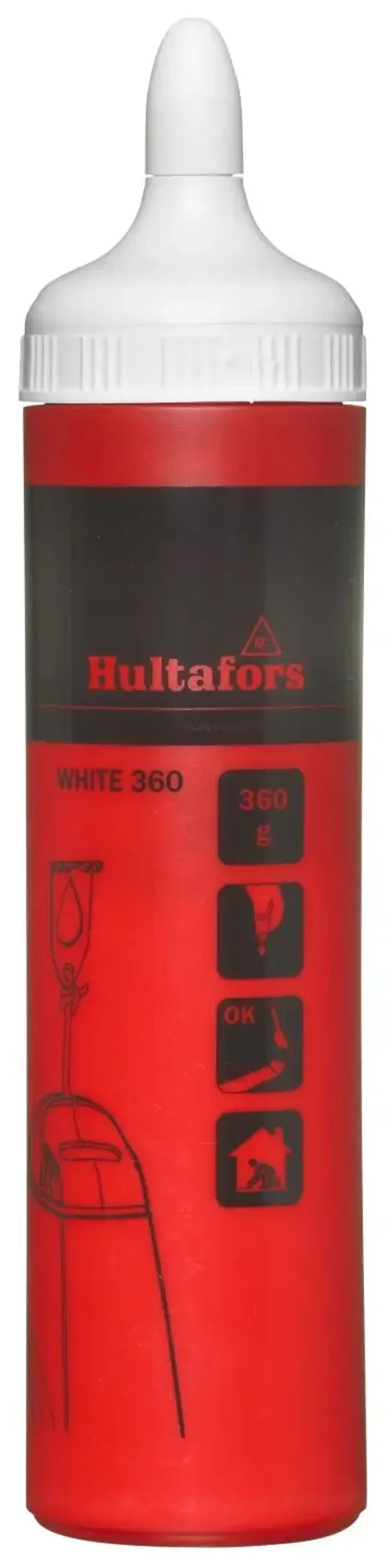 Vit krita till snörslå. Denna snörslåkrita är den enda kritan som går att måla över och är därför optimal för användning inomhus. Kritflaskan har ett lock med pip för att enkelt kunna fylla på din snörslå.