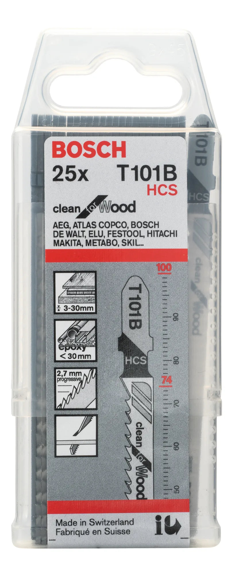 Rena snitt i mjuka träslag - T 101 B Clean for Wood sticksågblad gör rena, raka snitt i trä. Dess precisionsslipade tänder med dubbelkonisk kropp borgar för snyggt resultat. Bladet är tillverkat av stål med hög kolhalt, vilket är lämpligt för sågning i mjuka träslag och ej slipande trämaterial. Det har progressiv, fin tandutformning (2,7 mm) för sågning i trämaterial med tjockleken 3–30 mm. För användning med sticksågar med T-skaftsystem för fasthållning. Passar alla sticksågar med T-skaft.