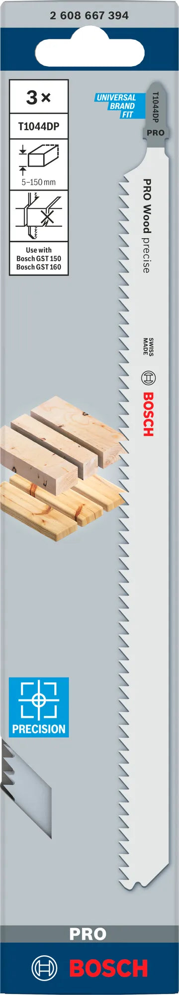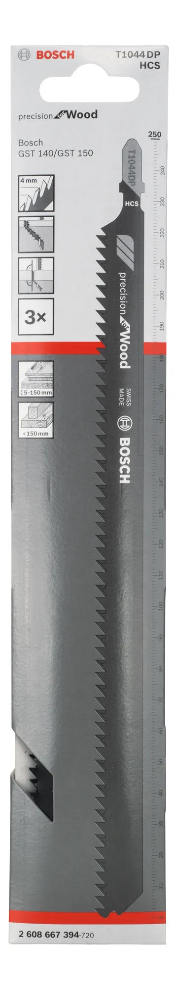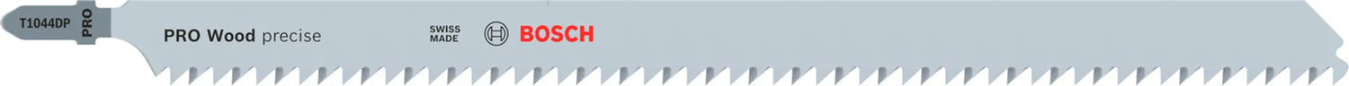 PRO Wood precise T1044DP är tillverkad av stål med hög kolhalt (HCS) så att du med lätthet kan hantera mjukt trä och en icke-nötande slipande trämaterial. Bladet är svårt att böja och har slipade sidotänder för att säkerställa att du får raka snitt i den vinkel du behöver. Bladet är 250 mm långt, vilket gör att du kan använda det för att såga arbetsstycken som är upp till 150 mm tjocka. Vi rekommenderar att den endast används med Bosch GST 150- och GST 160-sticksågar.