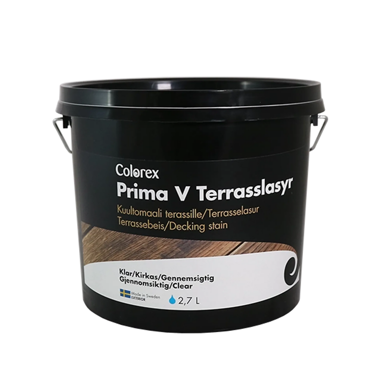 Prima V Terrasslasyr är en nyanserbar, extremt djuppenetrerande terrasslasyr baserad på vattenspädbar fet alkyd.. Terrasser, speciellt i lasyr-kulör, är bland det svåraste som finns att få snygga och hållbara. Kombinationen horisontell yta utsatt för alla vädrets växlingar, samt dessutom samtidigt ett golv som ska kunna belastas, ställer extremt höga krav på behandlingen. Produkten är specialanpassad för att möta dessa krav. Den passar för behandling av både nytt, tidigare obehandlat, såväl som tryckimpregnerat eller tidigare oljat trävirke. Produkten tränger in i trävirket och skyddar underlaget mot uttorkning och sprickbildning och motverkar blånad, alg- och mögelpåväxt. T ex på träaltaner och terrasser, men den fungerar givetvis även på fasader, stockverk, snickerier, trädgårds-möbler etc.