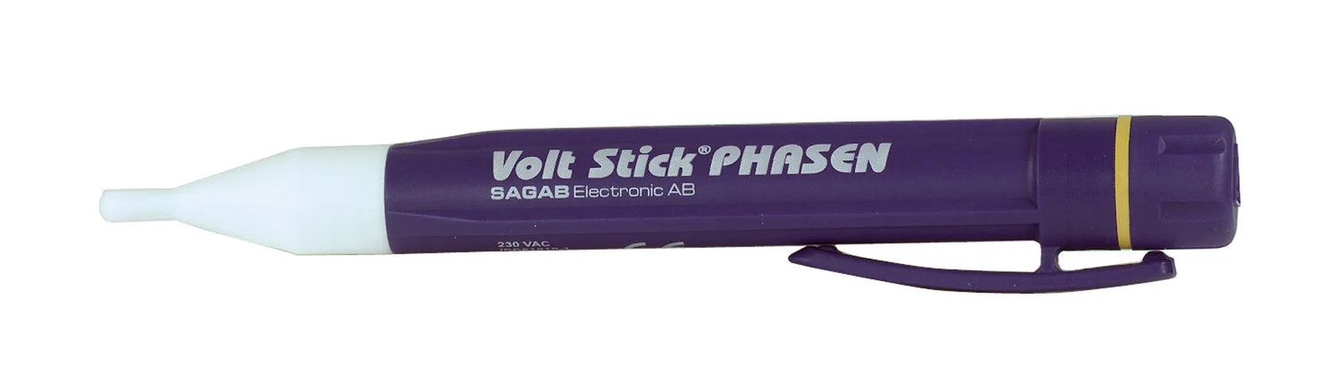 Spänningsprovaren Volt Stick PHASEN kontrollerar enkelt och med säkerhet växelspänning 230-1000 V i kablar, kontakter, säkringar m m. Kontroll görs utan kontakt med den farliga spänningen. Vid indikering av spänning visar Volt Stick PHASEN rött sken. Arbetstemperatur: -10°C till +50°C. Testinstrumentet drivs med 2 st 1,5 V batterier (LR03 alt. R03, storlek AAA). Batterier ingår. Idealisk för alla hantverkare, villaägare, lantbrukare m fl.