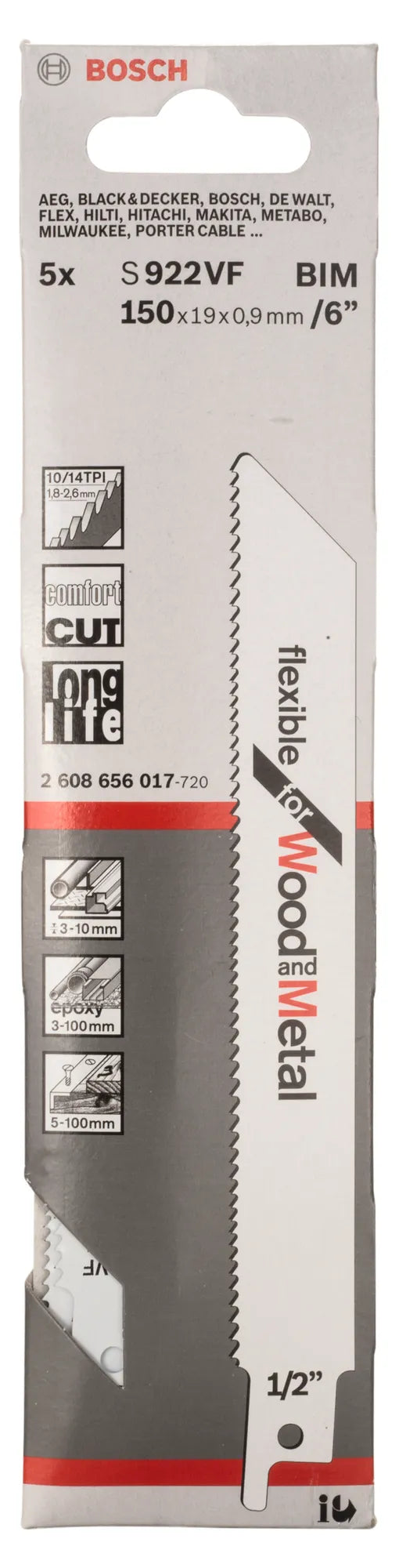 Enkel sågning - S 922 VF Flexible for Wood and Metal tigersågblad sågar jämt i trä och metall utan ansträngning. Vario-tandgeometrin (1,8/2,6 mm) gör sågningen jämn och vibrationsreducerad. Vidare är BIM-bladet (bimetall) optimerat för sågning genom mjuka spikar, mjukt stål och järnfri metall i trä. Detta tigersågblad har en standardlängd (150 mm) som ger en skärförmåga på upp till 100 mm. Det har ett 1/2-tums universalskaft. Passar alla tigersågar med S-skaft.