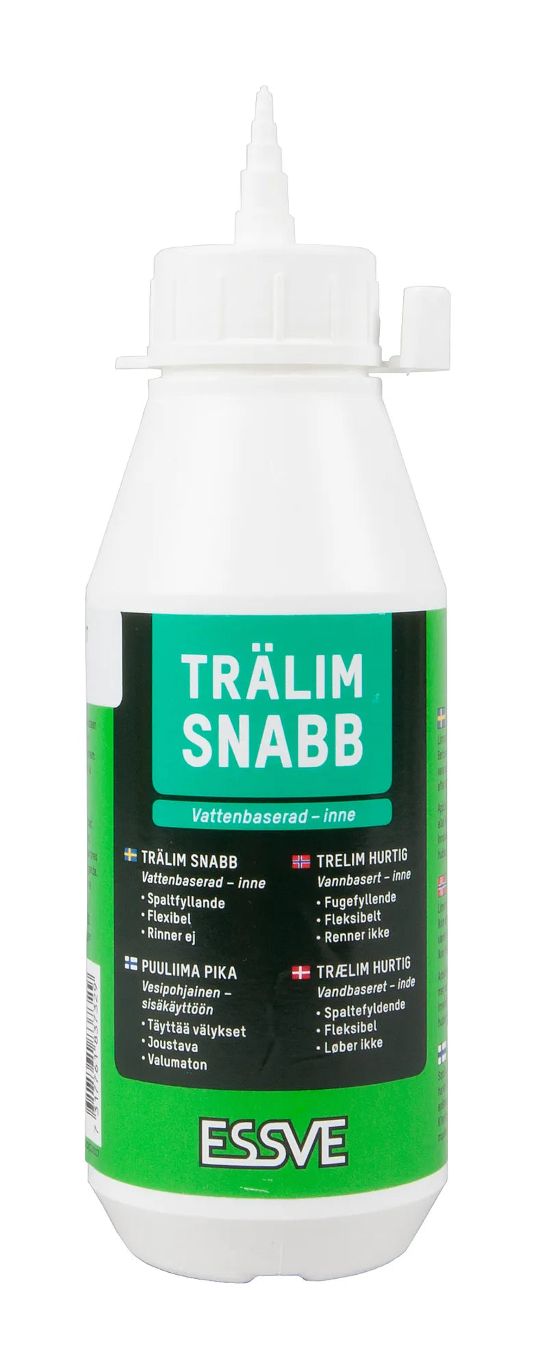ESSVE Trälim SNABB är ett flexibelt trälim som fäster inom 30 sekunder utan press. Limma trä mot trä, men kan även användas mot sten, betong, gips och leca. Passar för alla typer av applikationer där traditionellt trälim används, förutom hellimning.