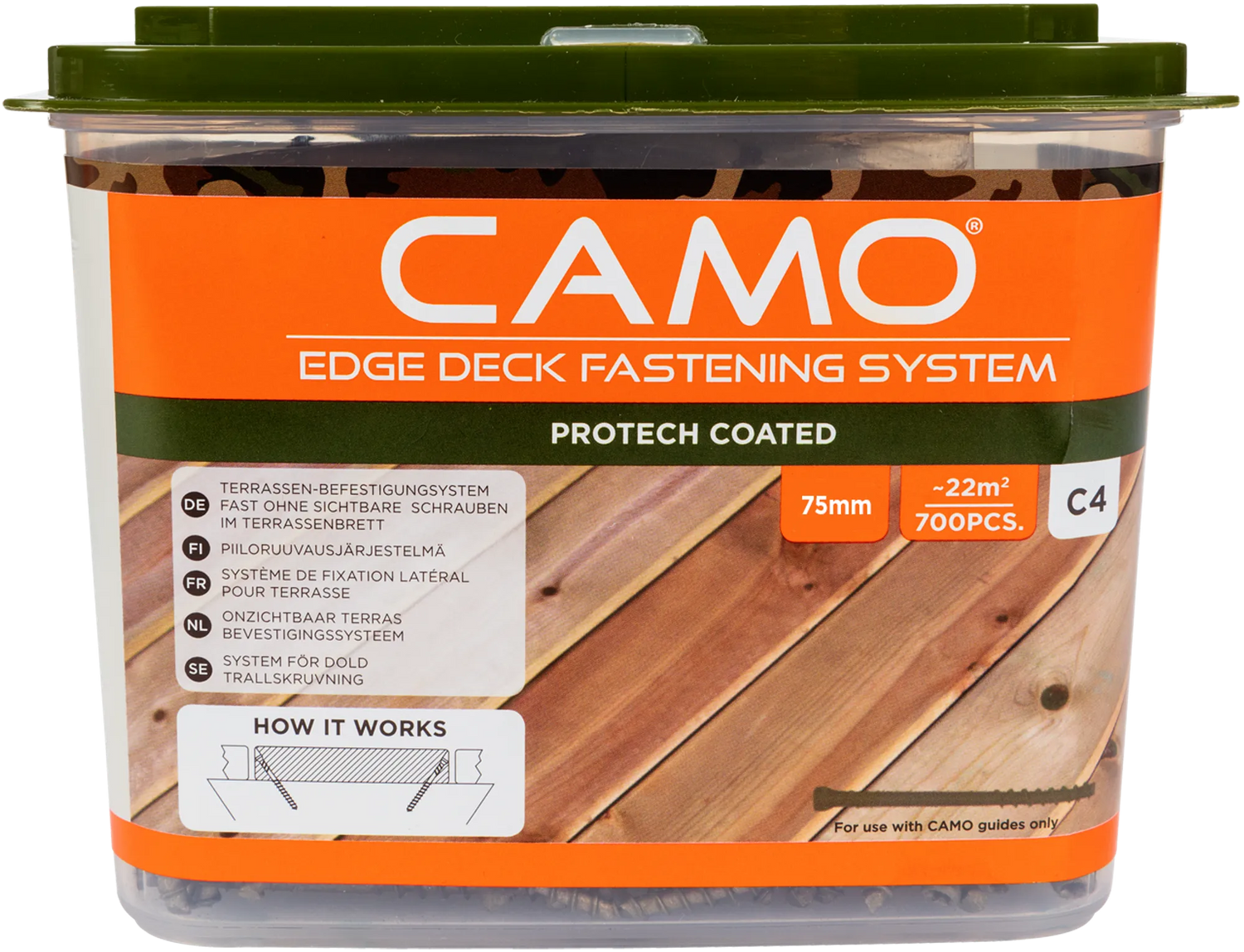 CAMO dold trallskruv ger snygga barfotasäkra altaner utan synliga skruvskallar. Den reverserande övre gängan på skruven drar materialen tätt samman och ger rena och snygga ingångshål. Med ett djupt T15 torx-spår får du ett bra grepp och den patenterade mejselspetsen klipper träfibrerna vid försänkningen vilket minimerar risken för sprickbildning i materialet. Används tillsammans med CAMO skruvfixturer.